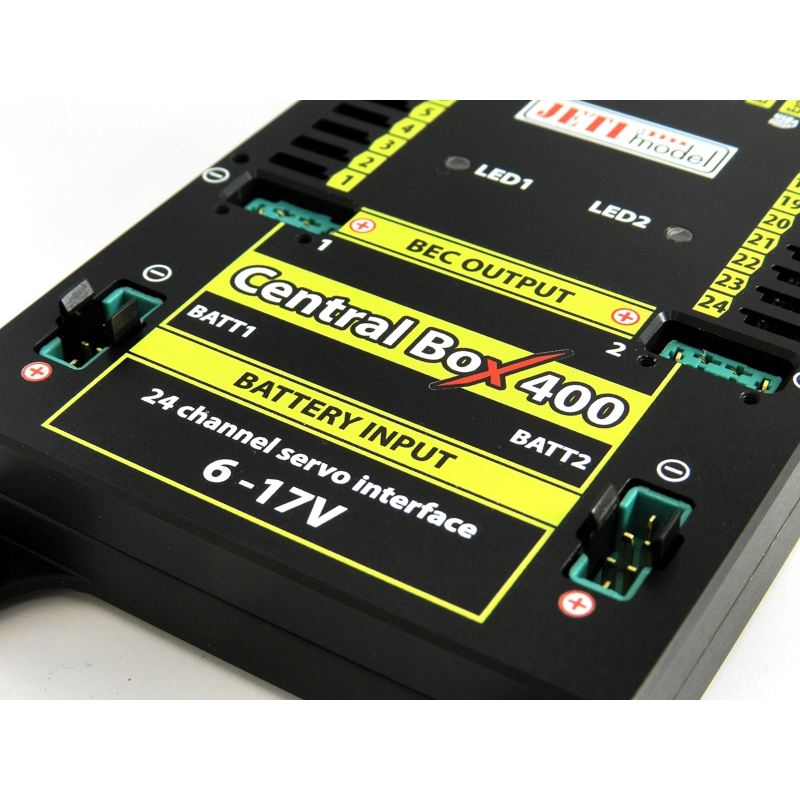Le Central box 400 de Jeti est à la fois un interrupteur, une double alimentation et un régulateur de tension (tension de sortie réglable).